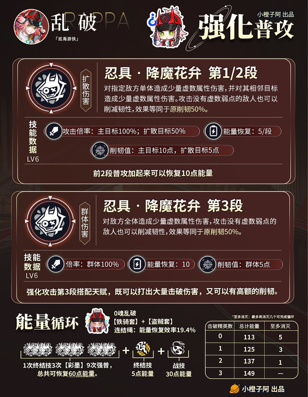 「乱破」是一位虚数属性的智识命途角色,作为一名群体击破C,主要是通过释放终结技开启【结印】状态,然后通过多段强化普攻来打出高额的击破伤害,虽说乱破有无视属性削韧能力,但是乱破在虚数弱点且虚构等对群环境里才能发挥最大的价值。