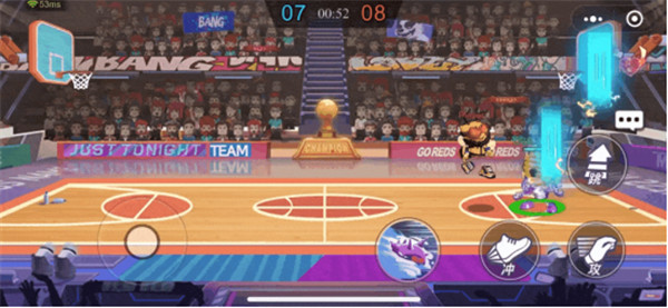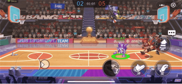 如果我们拿到了球,对手距离非常近,我们离球框还比较远时就可以跳起来用【虚拟闪现】+【冲】,瞬间到达篮筐扣篮。